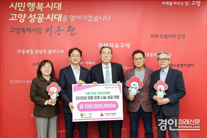 (경인미래신문=민경호 기자) 고양특례시(시장 이동환)는 지난 29일 고양시 덕양구 원당동에 소재한 서울·한양 컨트리클럽(서울 컨트리클럽 이사장 조갑주, 한양 컨트리클럽 대표이사 박용식)으로부터 어려운 이웃을 위한 사랑의 성금 1억 원을 전달받았다고 밝혔다.