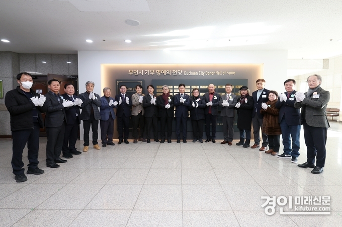 (경인미래신문=민경호 기자) 부천시는 지난해 12월 31일 부천시청 2층 어울마당 벽면에 나눔과 사회공헌을 실천한 시민을 예우하기 위한 ‘기부 명예의 전당’을 조성하고 제막식을 개최했다.