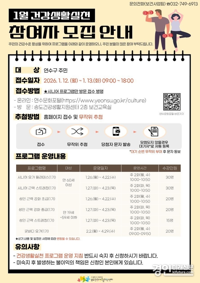(경인미래신문=민경호 기자) 인천 연수구(구청장 이재호) 송도건강생활지원센터는 오는 12일부터 2일 동안 ‘건강생활실천사업 운동프로그램’ 참여자를 모집한다.