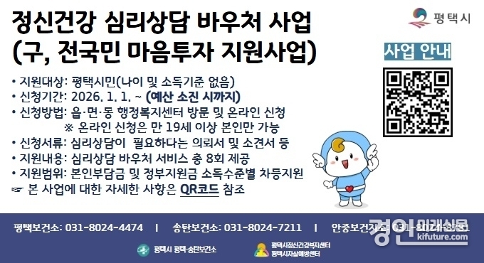 (경인미래신문=민경호 기자) 평택시(시장 정장선)에서는 시민의 마음 건강을 지키고 자살 예방 및 정신질환 조기 발견을 돕기 위한 ‘정신건강 심리상담 바우처사업’을 2026년에도 계속 추진한다.