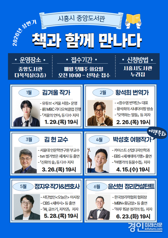 (경인미래신문=민경호 기자) 시흥시중앙도서관은 2026년 상반기 시민의 독서문화 향유 기회 확대와 인문적 소양 강화를 위해 운영하는 저자강연 ‘책과 함께 만나다’ 강연 출연진을 공개했다.