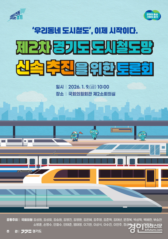 (경인미래신문=민경호 기자) 경기도가 ‘제2차 경기도 도시철도망 구축계획(′26~′35)’에 반영된 사업들의 실질적인 추진 방안 논의를 위해 9일 국회의원회관 제2소회의실에서 국회토론회를 연다.