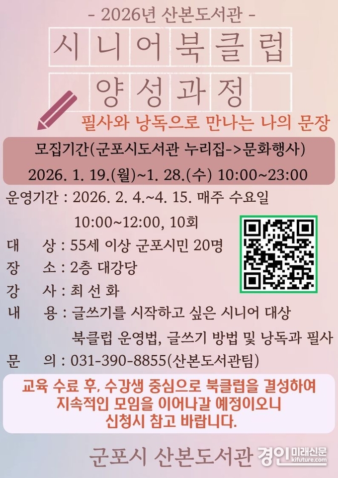 (경인미래신문=민경호 기자) 군포시산본도서관은 2026년에도 관내 시니어들에게 책을 통해 서로 소통하고 공감하는 능동적 독서교육 프로그램인 ‘시니어 북클럽 양성 과정’을 운영한다고 밝혔다.