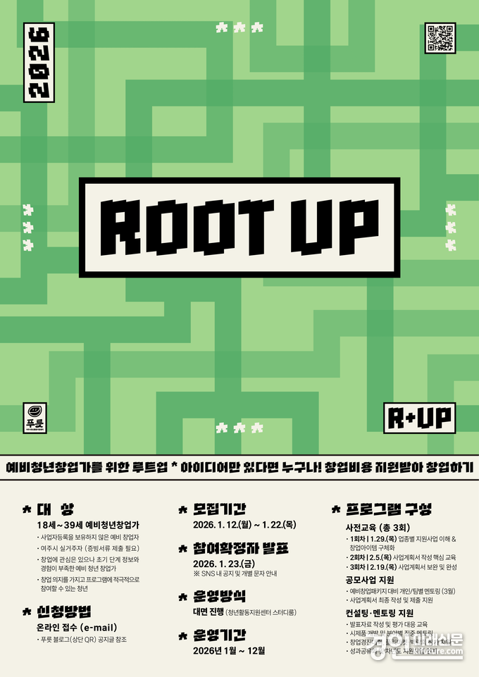 2026 예비청년창업자 지원사업 '루트업(Root Up)' 관련 자세한 사항은 푸릇 블로그(blog.naver.com/yjyouthcenter)를 통해 확인 할 수 있다.