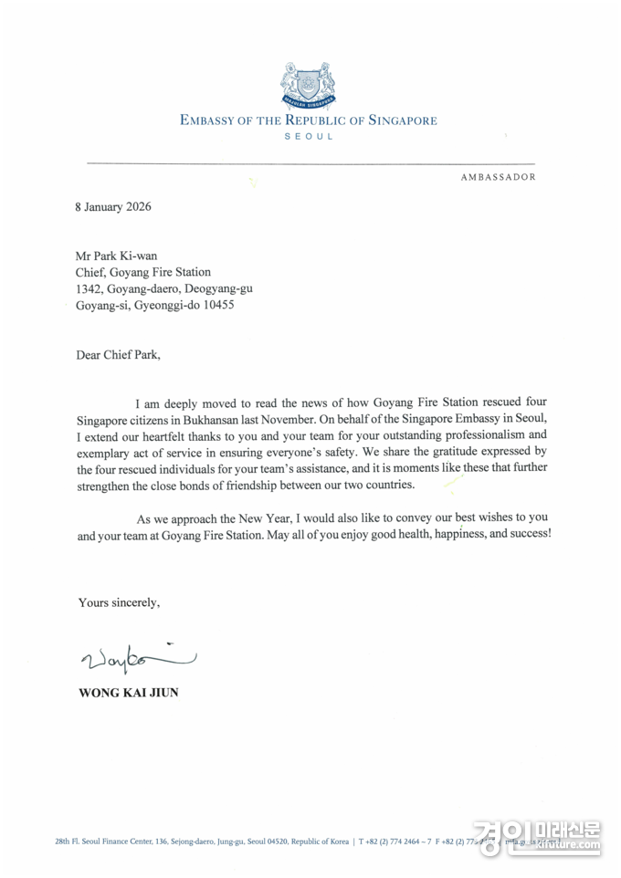 (경인미래신문=민경호 기자) 고양소방서(서장 박기완)는 지난 8일 주한 싱가포르 대사관으로부터 공식 감사 서한을 받았다고 밝혔다.
