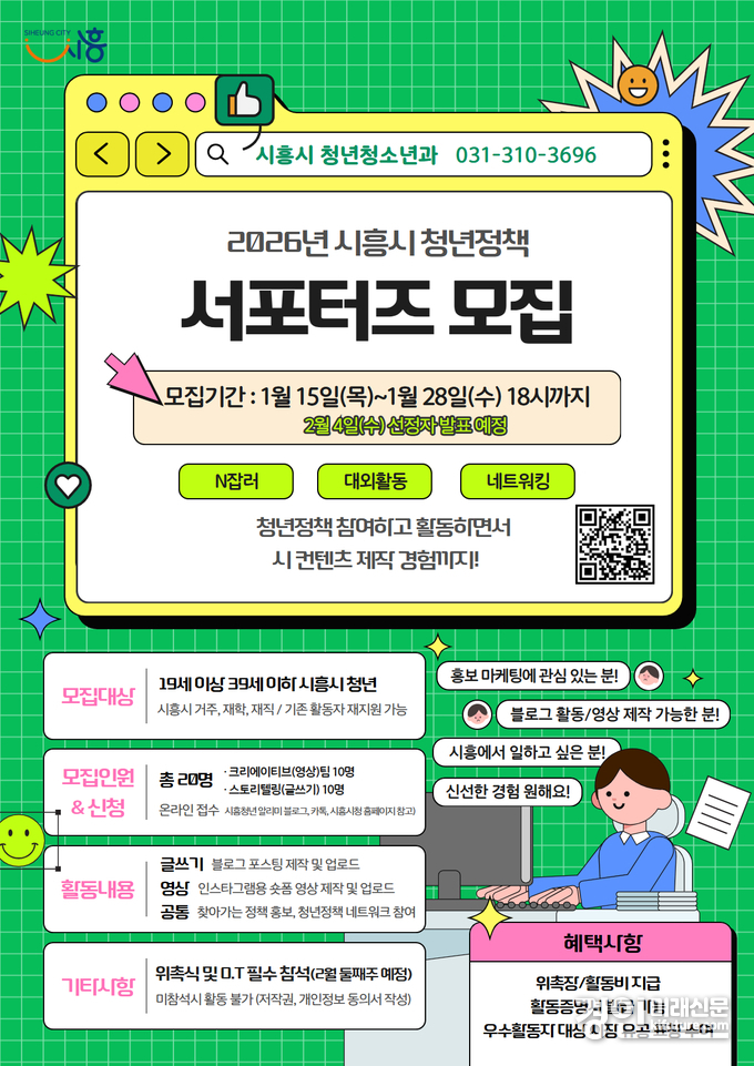 (경인미래신문=민경호 기자) 시흥시(시장 임병택)는 청년의 눈높이에서 정책 정보를 전달하고 현장의 목소리를 시정에 반영하기 위해 ‘2026년 시흥시 청년정책 서포터즈’를 1월 15일부터 28일까지 모집한다.