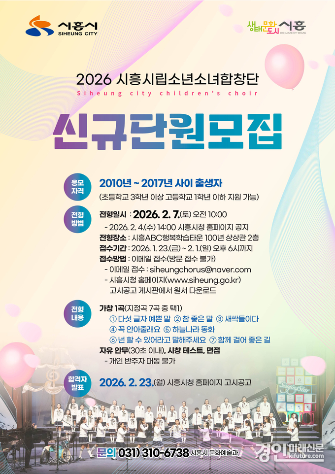 (경인미래신문=민경호 기자) 시흥시(시장 임병택)는 시흥의 문화사절단으로서 아름다운 화음을 함께 만들어 갈 ‘2026년도 시흥시립소년소녀합창단’의 신규단원을 공개 모집한다.