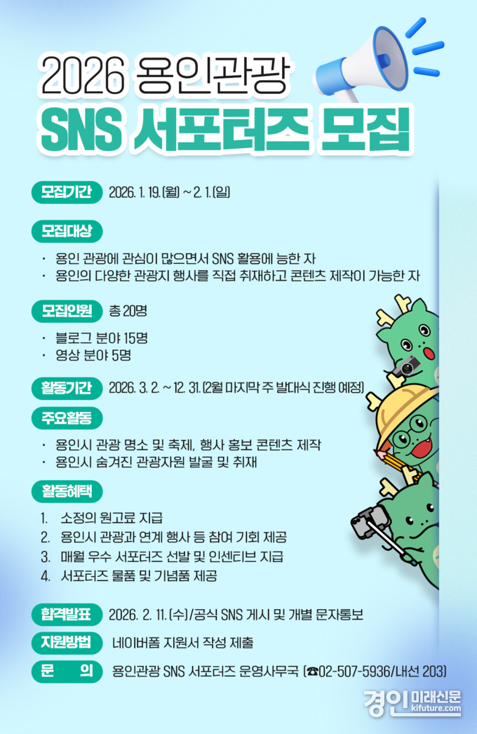(경인미래신문=권민준 기자) 용인특례시(시장 이상일)는 2월 1일까지 용인의 관광자원과 다채로운 축제·행사를 시민의 시각에서 생동감 있게 홍보할 ‘용인관광 SNS 서포터즈’를 모집한다고 20일 밝혔다.