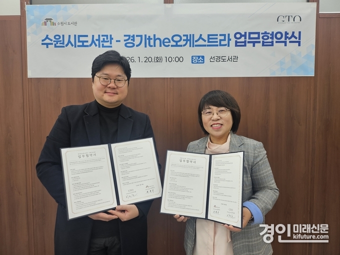 (경인미래신문=민경호 기자) 수원시도서관은 경기더(the)오케스트라는 지난 20일 수원시 도서관사업소에서 업무협약을 체결하고 공공도서관을 중심으로 한 시민 참여형 문화예술 프로그램 운영에 협력하기로 했다.
