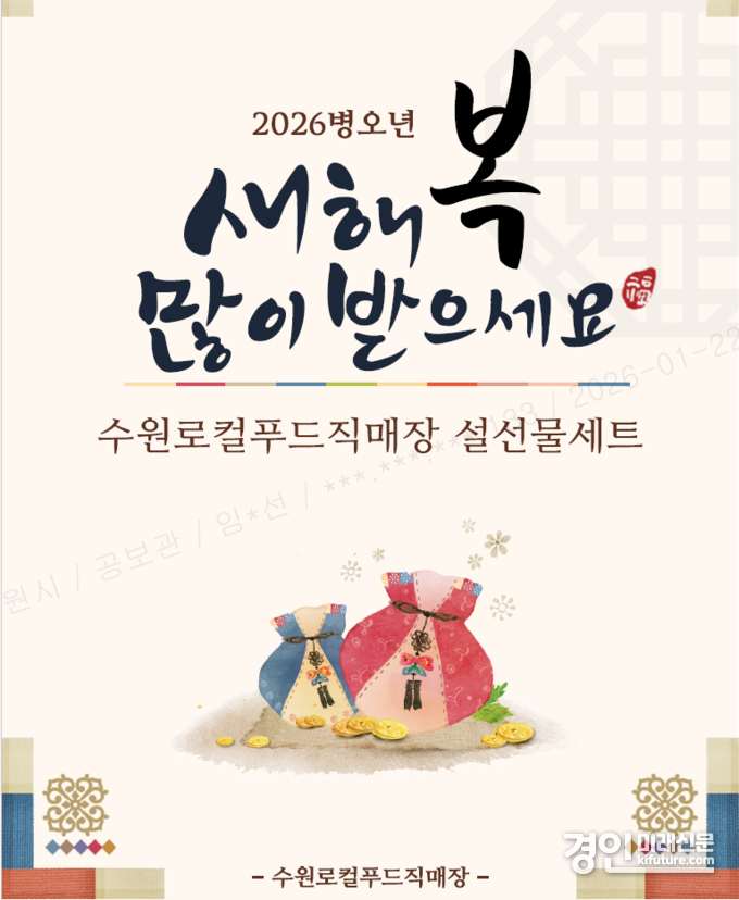 (경인미래신문=민경호 기자) 수원로컬푸드직매장이 설 명절을 맞아 1월 26일부터 2월 9일까지 우리 농산물로 구성된 ‘설 명절 선물 세트’ 사전예약 판매를 한다. 택배 신청은 2월 9일 오전까지 할 수 있고 배송은 2월 9~13일 이뤄진다.