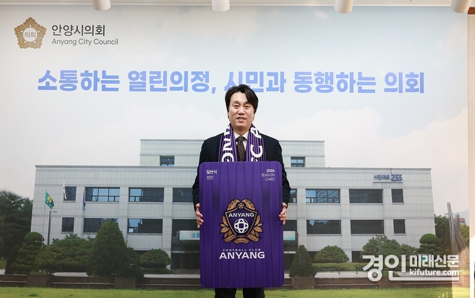 (경인미래신문=민경호 기자) 안양시의회 박준모 의장이 지난 23일 시의회 의장실에서 2026시즌 FC안양 연간회원권을 구매했다.