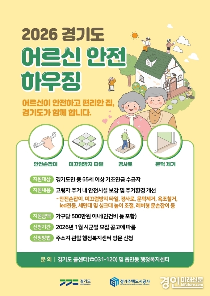 (경인미래신문=민경호 기자) 의왕시(시장 김성제)가 어르신 주거 안전사고 예방을 위한 '경기도 어르신안전하우징 지원사업' 신청을 2월 19일까지 받는다.