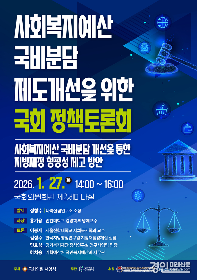 (경인미래신문=민경호 기자) 부천시가 주관하고 국회 보건복지위원회 소속 서영석 국회의원(부천시 갑)이 주최하는 ‘사회복지예산 국비분담 제도개선을 위한 국회 정책토론회’가 오는 27일 오후 2시, 국회의원회관 제2세미나실에서 열린다.