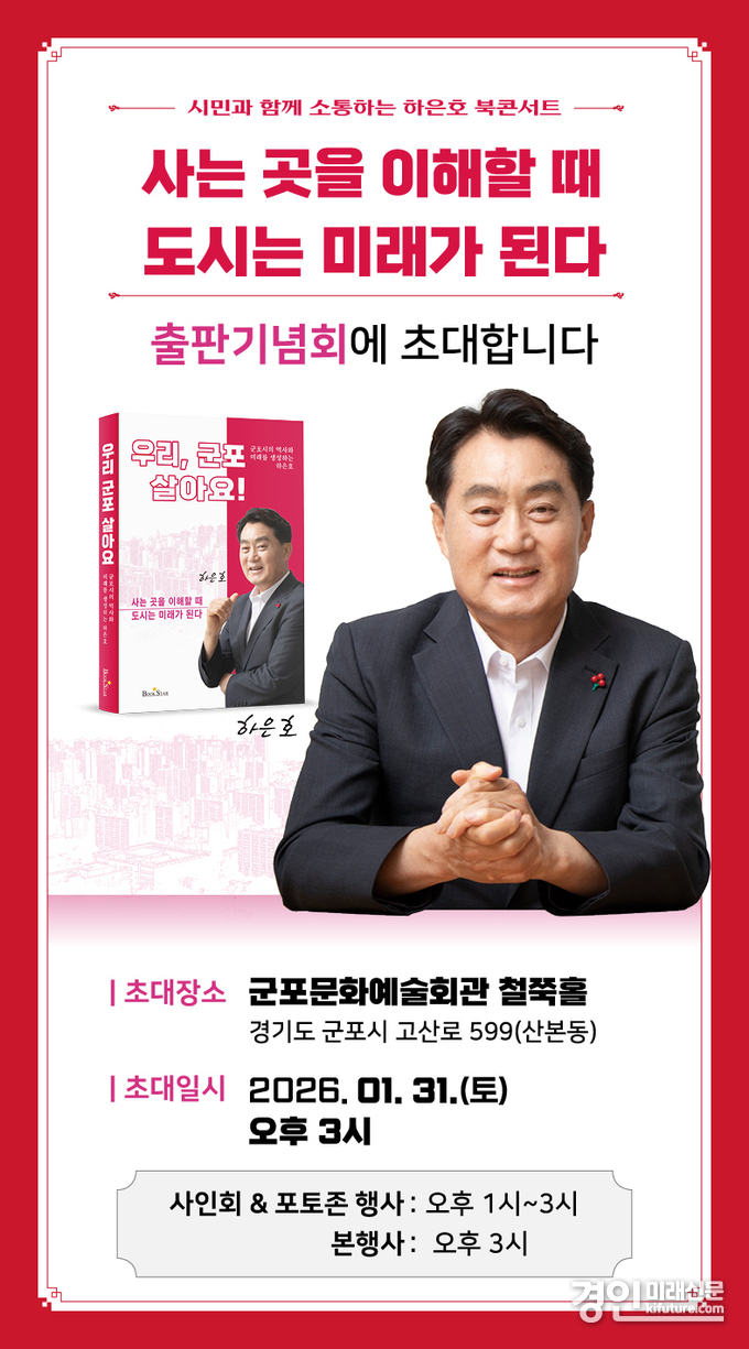 (경인미래신문=민경호 기자) 하은호 군포시장이 저서 '우리 군포살아요' 출판을 기념하는 북콘서트를 오는 31일 오후 3시 군포문화예술회관에서 연다.