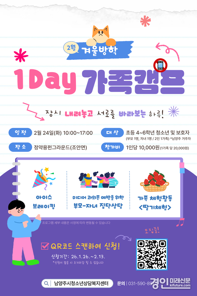 (경인미래신문=최대성 기자) 남양주시는 26일부터 2월 13일까지 초등학교 4~6학년 자녀를 둔 10가족을 대상으로 겨울방학 ‘1Day 가족 캠프’ 참가 신청을 받는다고 밝혔다.