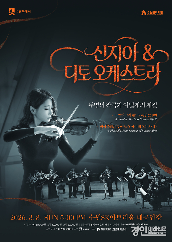 수원문화재단 관계자는 “이번 공연은 유럽의 바로크와 남미의 탱고가 표현하는 사계절을 한자리에서 경험할 수 있는 기회다”며 “계절의 변화를 섬세하게 그려내는 연주에 시민 여러분의 많은 관심을 바란다”고 전했다.