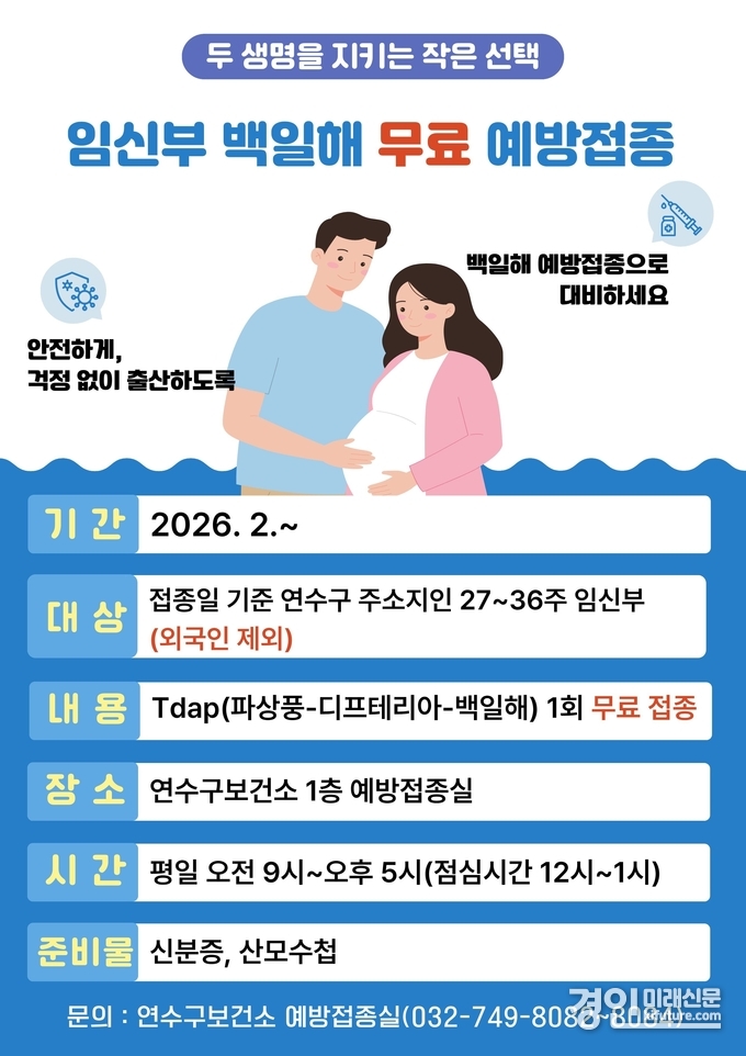 (경인미래신문=민경호 기자) 인천 연수구(구청장 이재호)는 관내 임신부와 신생아의 면역 형성을 지원하기 위해 다음달부터 임신부를 대상으로 백일해 예방접종을 보건소에서 무료로 실시한다.
