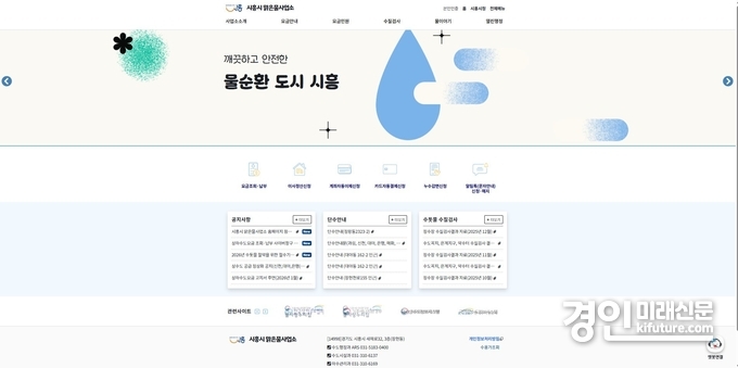 (경인미래신문=민경호 기자) 시흥시는 시민들이 상하수도 관련 정보를 더 쉽고 편리하게 이용할 수 있도록 맑은물사업소 누리집을 새롭게 바꾸고 오는 2월 2일부터 운영을 시작한다.