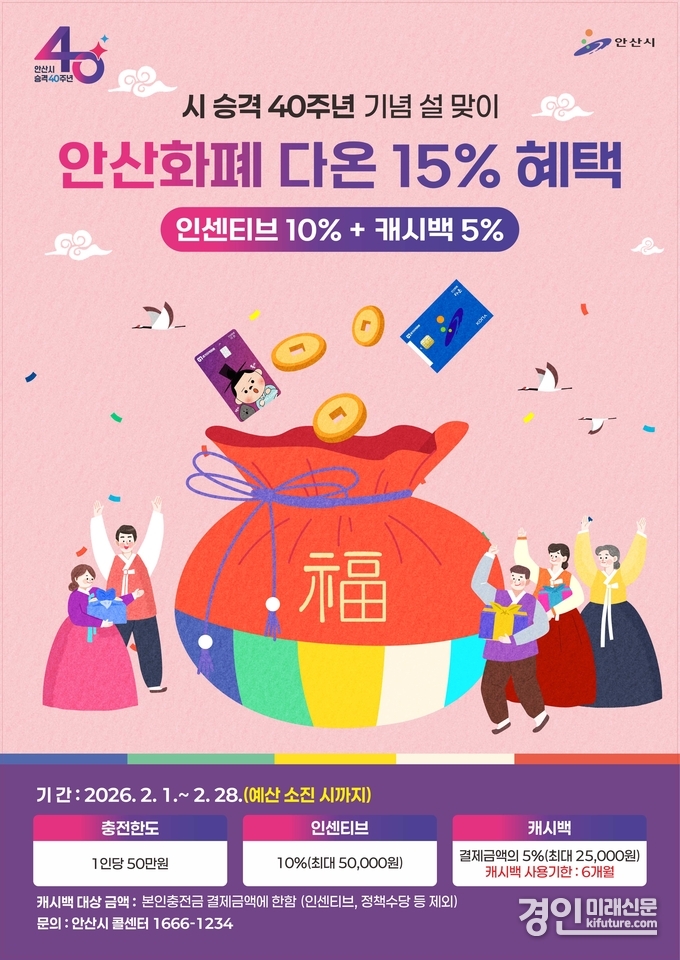(경인미래신문=민경호 기자) 안산시(시장 이민근)는 시 승격 40주년을 기념하고 시민들의 설 명절 부담을 덜어주고자 지역화폐 ‘다온’의 소비 혜택을 강화한다고 30일 밝혔다.