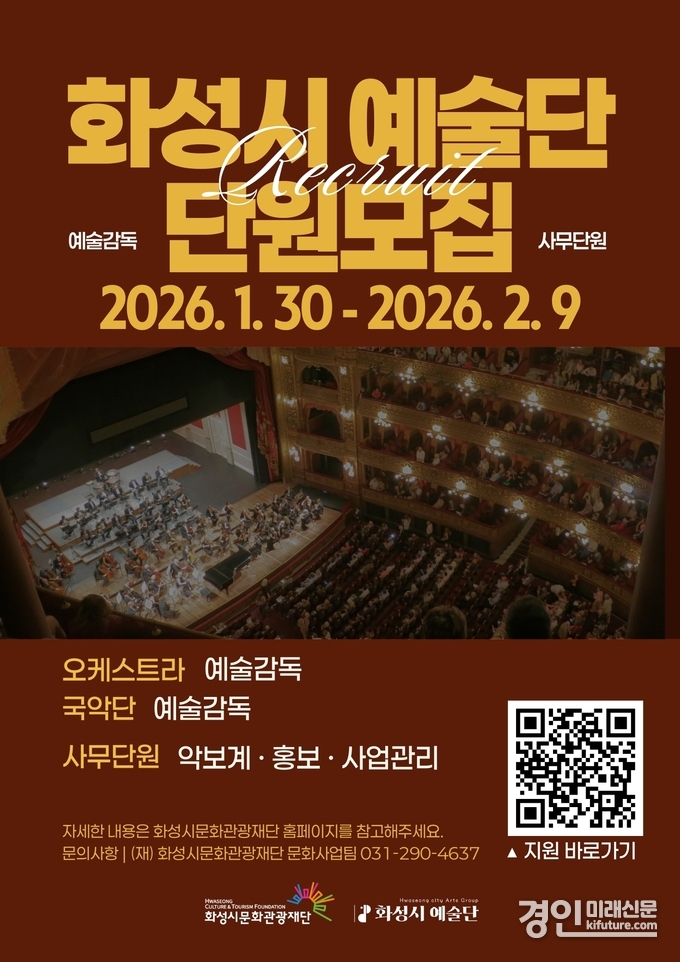 (경인미래신문=민경호 기자) (재)화성시문화관광재단(대표이사 안필연)은 2026년 ‘화성시 예술단’을 이끌어갈 예술감독과 사무단원을 모집한다.