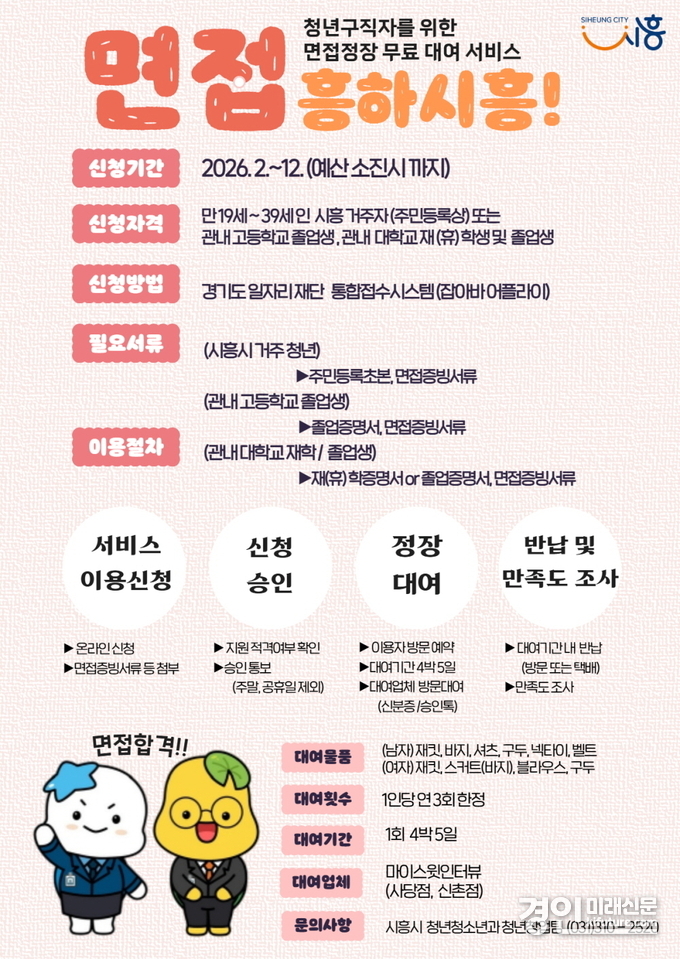 (경인미래신문=민경호 기자) 시흥시가 청년 구직자의 사회 진출을 응원하기 위해 2026년도 면접정장 대여지원 사업 ‘면접 흥하시흥!’을 2월 1일부터 시작한다.