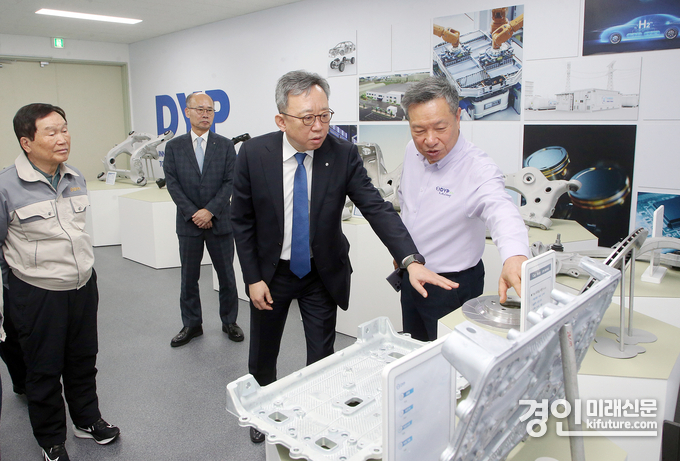 (경인미래신문=민경호 기자) 신한은행 정상혁 은행장은 지난 1월 30일 경기도 화성시에 위치한 디와이피㈜ 공장을 방문해 친환경차 부품 생산 현장을 둘러보고 기업이 겪고 있는 금융 애로사항과 향후 성장 과정에서 필요한 지원 방안을 논의했다.