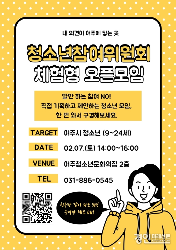 체험형 오픈모임은 2월 7일 오후 2시부터 4시까지 여주청소년문화의집 2층 청소년활동실에서 진행되며 청참위 정기모임을 참관하고 활동 내용을 살펴볼 수 있다.