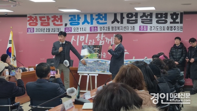 (경인미래신문=민경호 기자) 경기도의회 이영주 의원(국민의힘, 양주1)은 지난 2일 양주2동 행정복지센터에서 양주시 청담천·광사천 지방하천 정비사업과 관련한 주민 대상 사업설명회를 개최하고 사업 추진 현황을 점검하는 한편 주민 건의사항을 직접 청취했다.