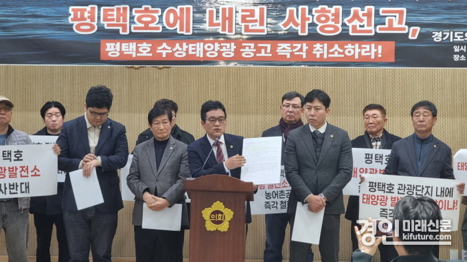 (경인미래신문=민경호 기자) 경기도의회 이학수 의원(국민의힘, 평택5)은 5일 경기도의회 기자회견장에서 기자회견을 열고 한국농어촌공사가 발표한 평택호 수상태양광 사업 공고의 즉각적인 취소를 강력히 요구했다.