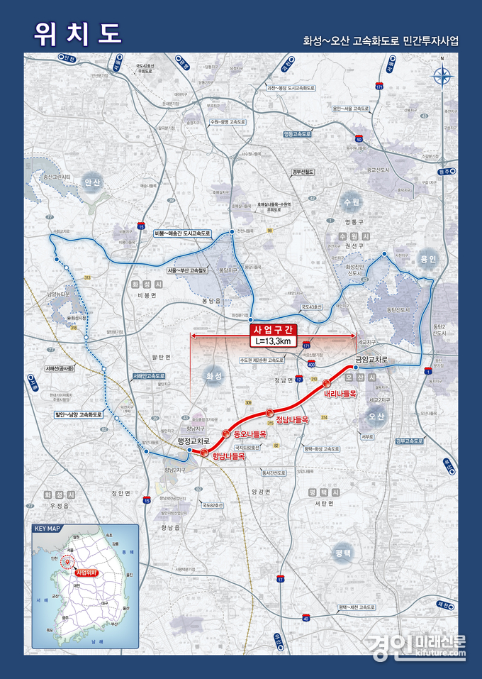 이 사업은 화성시 향남읍에서 오산시 금암동까지 약 13.3km 구간을 연결하는 왕복 4차로 자동차전용도로를 건설하는 것으로 개통 시 수도권 서남부 지역의 교통 혼잡 해소와 이동 시간 단축, 산업·주거지역 접근성 개선에 크게 기여할 것으로 기대된다.