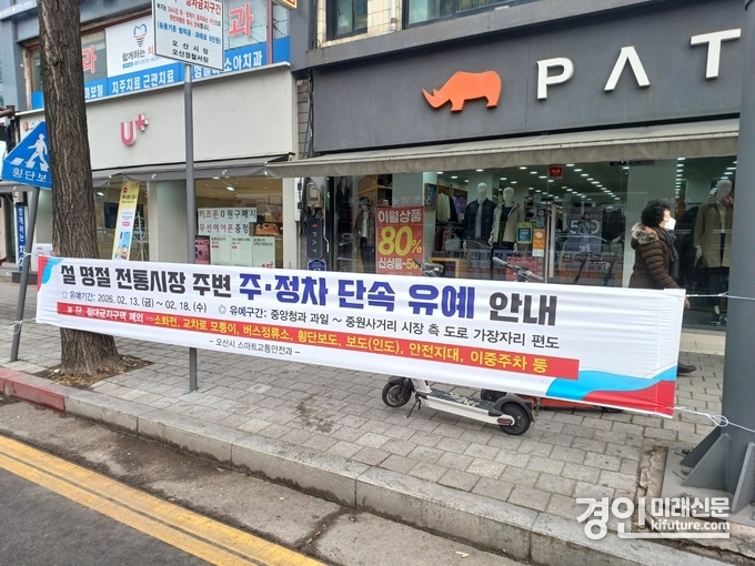 (경인미래신문=민경호 기자) 오산시(시장 이권재)는 2026년 설 명절을 맞아 전통시장 이용 편의를 높이고 지역경제 활성화를 도모하기 위해 오색시장 주변 주정차 단속을 오는 13일부터 18일까지 한시적으로 유예한다고 밝혔다.