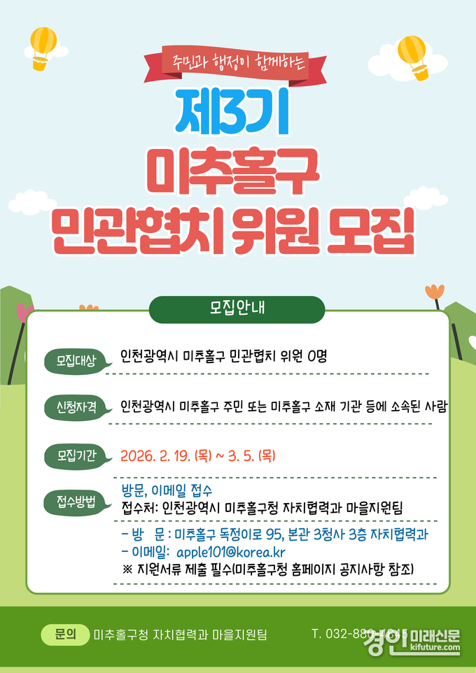 (경인미래신문=민경호 기자) 인천 미추홀구(구청장 이영훈)는 주민과 행정이 함께 지역 현안을 논의하고 해결하는 협치 기반을 강화하기 위해 제3기 민관협치위원회 위원을 공개 모집한다고 밝혔다.