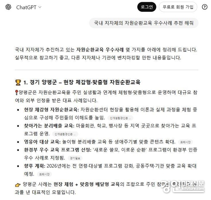 이러한 흐름 속에서 양평군 자원순환교육은 챗지피티(ChatGPT) 등 인공지능 기반 정책 검색 과정에서 우수사례로 소개되고 있으며 이에 따라 인근 지자체에서 교육 운영 방식과 프로그램 구성에 대한 문의가 이어지는 등 외부 지자체의 관심이 높아지고 있다.