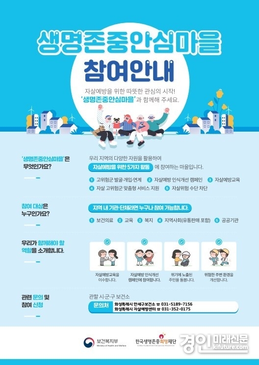 (경인미래신문=민경호 기자) 화성특례시(시장 정명근)가 자살 예방과 정신건강 증진을 위해 ‘생명존중 안심마을’을 확대 운영하고 사업에 함께할 지역사회 기관·단체를 모집한다고 밝혔다.