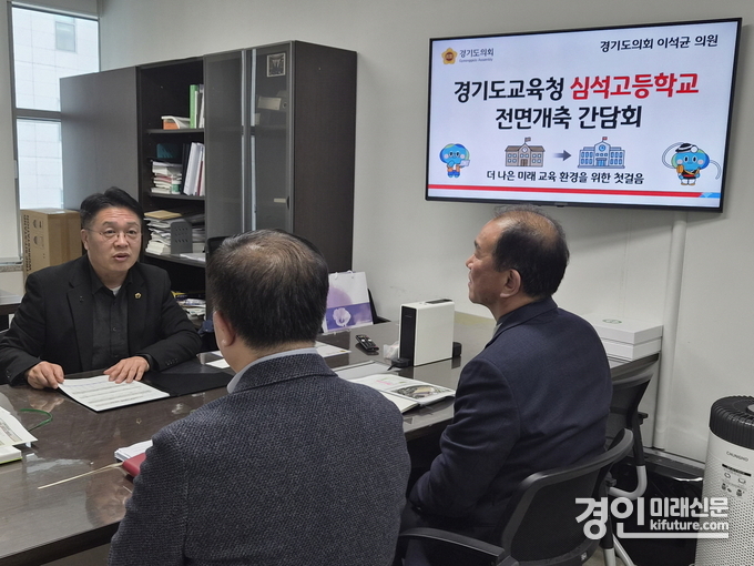 (경인미래신문=민경호 기자) 경기도의회 이석균 의원(국민의힘, 남양주1)은 지난 24일 경기도의회에서 성동규 경기도교육청 학교공간조성과장, 남진희 팀장 등 관계자들과 정담회를 열고 남양주시 화도읍 심석고등학교 공간재구조화사업의 추진 현황과 향후 일정, 사업 방향 전반을 점검했다.
