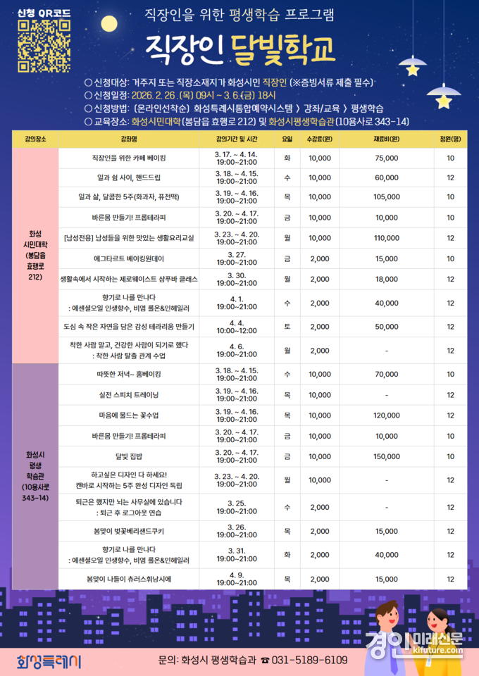(경인미래신문=민경호 기자) 화성특례시(시장 정명근)는 26일부터 3월 6일까지 직장인 달빛학교 1차 수강생을 선착순으로 모집한다고 밝혔다.