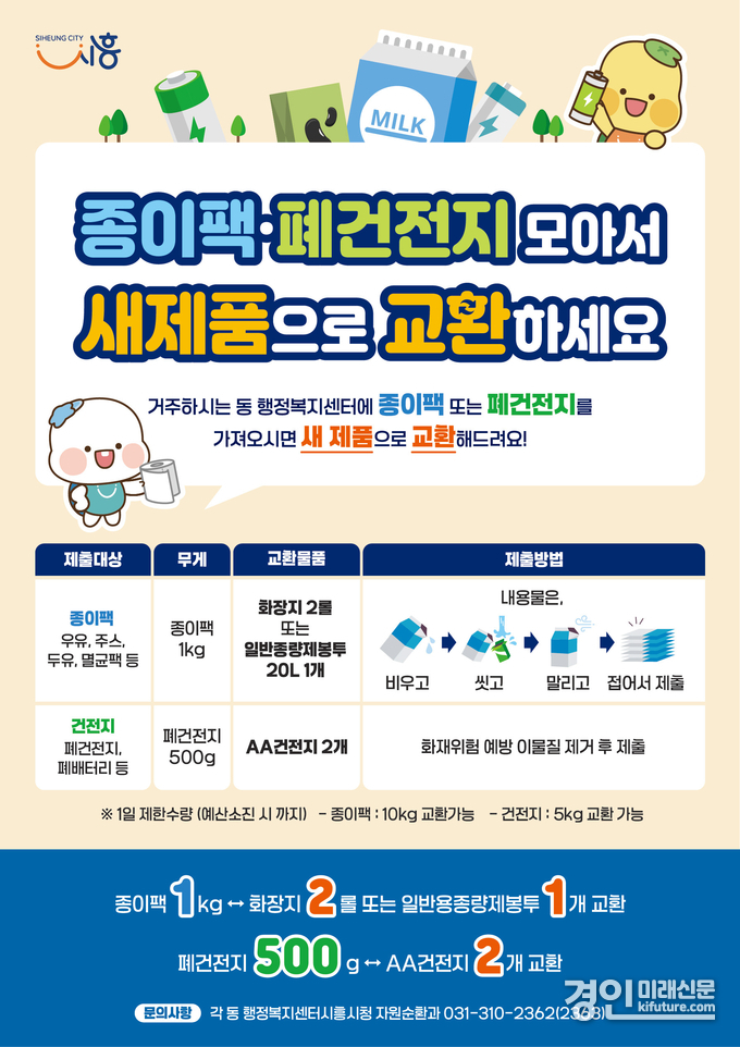 (경인미래신문=민경호 기자) 시흥시(시장 임병택)는 생활 속 자원순환 문화 확산을 위해 종이팩 교환 사업을 지속 추진하는 한편, 올해부터 폐건전지 교환 사업을 확대 시행한다.