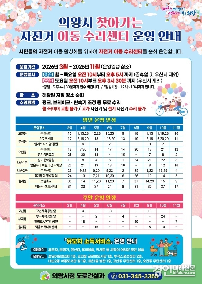 (경인미래신문=민경호 기자) 의왕시가 시민들의 자전거 이용 활성화와 안전한 자전거 문화 확산을 위해 '2026년 찾아가는 자전거 이동 수리센터'를 운영한다.
