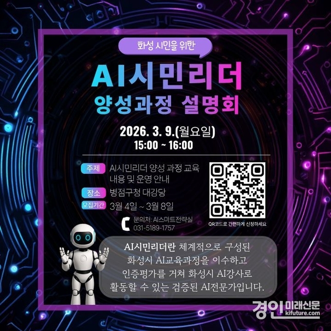(경인미래신문=민경호 기자) 화성특례시(시장 정명근)는 시민이 학습하고 교육하는 인공지능(AI) 학습 체계 구축을 위해 ‘2026년 AI시민리더 양성 교육’ 설명회를 오는 9일 오후 3시에 병점구청 대강당에서 개최한다.