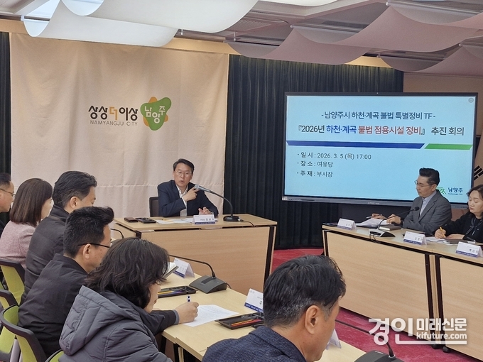 (경인미래신문=민경호 기자) 남양주시는 지난 5일 ‘남양주시 하천·계곡 불법 특별정비 TF’를 구성하고 첫 회의를 개최하고 하천 내 불법시설물 근절과 수변 환경 재정비에 본격 나선다고 6일 밝혔다.