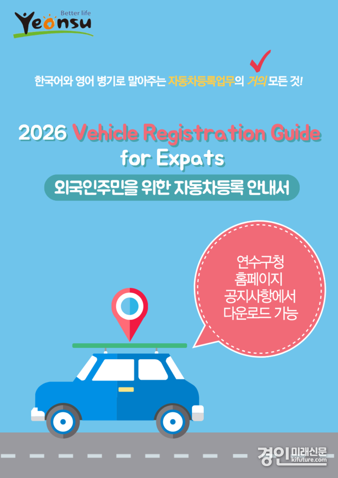(경인미래신문=민경호 기자) 인천 연수구(구청장 이재호)는 지난달 27일부터 인천광역시 자치구 최초로 ‘외국인 주민을 위한 자동차등록 안내서(‘2026 Vehicle Registration Guide for Expats)’를 제작하고 구청 누리집을 통해 PDF 파일로 무료 배포하고 있다.