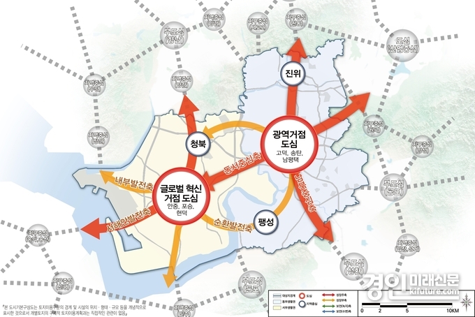 동부 생활권은 첨단산업과 연구개발, 국제교류 기능을 중심으로 경쟁력을 강화하고, 서부 생활권은 평택항과 연계한 물류, 수소산업, 해양관광 기능을 중심으로 육성할 계획이다.