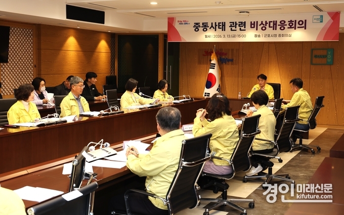 (경인미래신문=민경호 기자) 군포시는 최근 중동 지역 정세 불안으로 국제 에너지 가격 변동이 우려됨에 따라 지역 경제에 미칠 수 있는 영향을 선제적으로 점검하기 위해 13일 시청 중회의실에서 ‘중동사태 관련 비상대응회의’를 긴급 개최했다고 밝혔다.