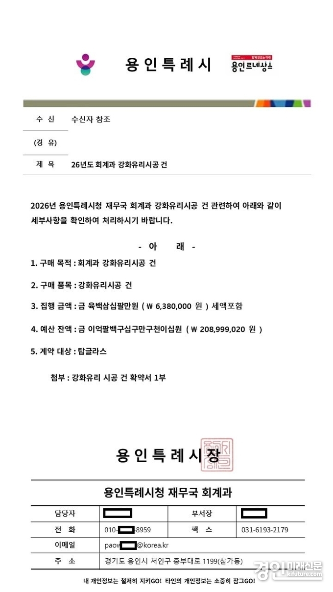 (경인미래신문=민경호 기자) 용인특례시(시장 이상일)는 공공기관 직원을 사칭해 업체로부터 대금을 챙기거나 선결제를 유도하는 사기 사건이 발생하자 각별한 주의를 당부하며 피해 예방을 위해 행정력을 집중하고 있다고 17일 밝혔다.
