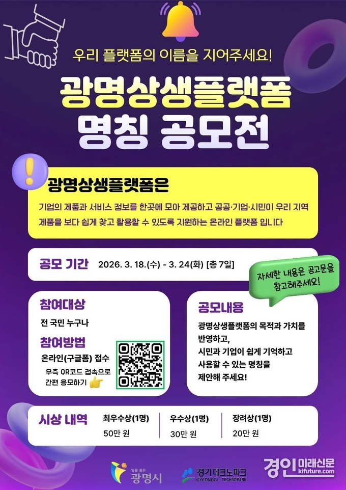 참여를 원하는 시민은 광명상생플랫폼(gmplatform.co.kr), 광명시청 누리집(gm.go.kr), 경기테크노파크 누리집(gtp.or.kr)에서 세부 내용을 확인한 뒤 홍보문 내 큐알(QR)코드로 제출하면 된다.