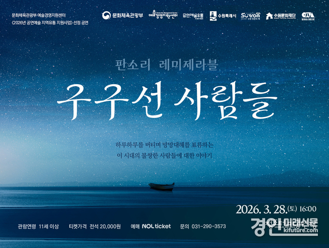 수원문화재단(대표이사 곽도용)은 정조테마공연장에서 오는 28일 오후 4시, 문화체육관광부와 예술경영지원센터의 ‘2026 공연예술 지역유통 지원사업’ 선정작인 ‘판소리 레미제라블 '구구선 사람들'’을 선보인다.