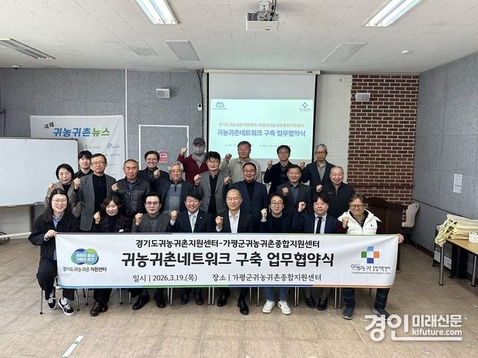 (경인미래신문=민경호 기자) 경기도귀농귀촌지원센터와 가평군귀농귀촌종합지원센터는 지난 19일 가평군 귀농귀촌종합지원센터 교육장에서 귀농귀촌 네트워크 구축을 위한 공동업무협약(MOU)을 체결했다.