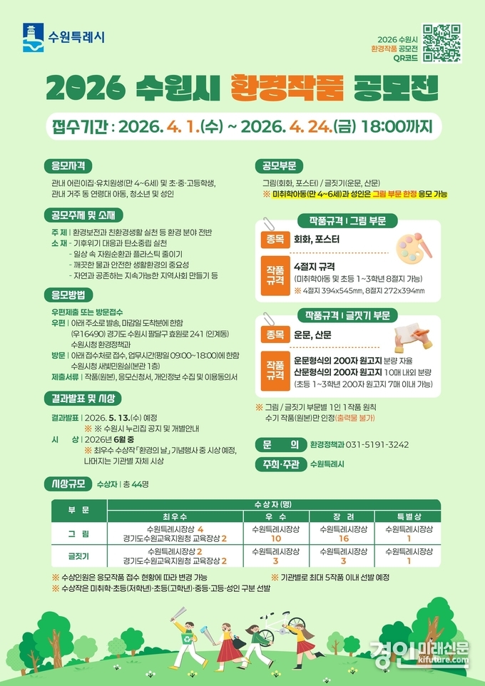 (경인미래신문=민경호 기자) 수원특례시(시장 이재준)가 제31회 환경의 날(6월 5일)을 맞아 4월 1일부터 24일까지 환경 작품(그림, 글짓기)을 공모한다.