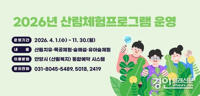 (경인미래신문=민경호 기자) 안양시(시장 최대호)는 4월부터 서울대 안양수목원을 비롯한 관내 수목원에서 ‘산림체험 프로그램’ 운영을 현재 통합예약시스템을 통해 사전 예약을 접수 중이라고 23일 밝혔다.