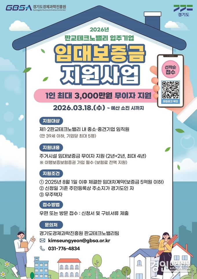 ‘2026년 판교테크노밸리 입주기업 임대보증금 지원사업’은 제1·2판교테크노밸리 입주 중소·중견기업 재직자를 대상으로 최대 3천만 원의 임대보증금을 최장 4년간 무이자로 지원한다.